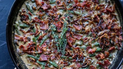 A low carb and keto friendly recreation of a classic green bean casserole with fresh green beans, a homemade mushroom gravy, and crispy bacon and fried onion topping!