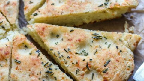 A delicious, low carb, and keto friendly almond flour based focaccia bread baked in a cast iron skillet. Top with garlic confit and rosemary and sea salt and you have the perfect keto friendly bread recipe!