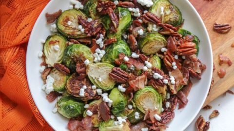 The perfect keto friendly fall side dish that serves a crowd this holiday season. Crispy, roasted brussel sprouts, cooked prosciutto and toasted pecans, topped with crumbled goat cheese to tie it all together.