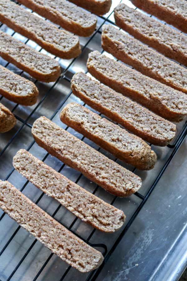 Once the biscotti has rested, I divide each loaf into 12 cookies. The second bake is to help get the cookies nice and crispy. I prefer to elevate mine and lay them open face on a baking rack over the silpat mat to help with this process. Allow them to fully cool and harden before storing.