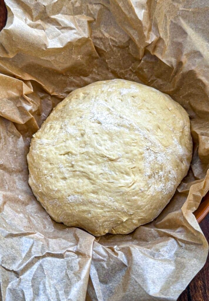 - Place a piece of parchment paper on your work surface and lightly dust with flour. Gently turn the dough out onto the parchment. Using floured hands or a dough scraper, fold the edges inward once or twice to form a loose round loaf. Do not knead.Let the dough rest for 30–45 minutes while the oven preheats.