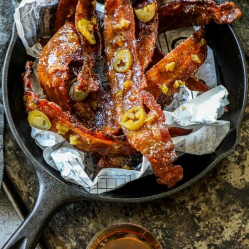My honey jalapeño bacon recipe takes the savory flavor of bacon and balances it with brown sugar and honey, making candied bacon. Topped off with pickled jalapeños, this bacon is the perfect balance of salty, sweet, spicy and tangy!