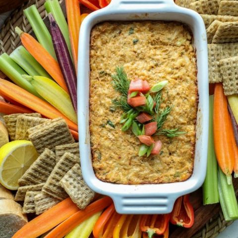 A delicious, hot smoked dip made with lump crab, cheeses, fresh dill, and green onion. This easy to make low carb keto friendly crab dip is the perfect appetizer or topping for your next surf and turf dinner.