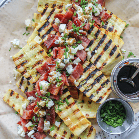 This easy grilled yellow summer squash recipe is a perfect, quick, weeknight recipe you can toss on the grill for family and friends. It comes together and packs a ton of flavor with crispy grilled bacon it's, blue cheese, and sweet balsamic sauce over the top!