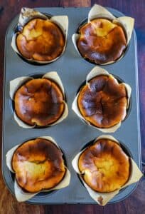 - The mini basque cheesecakes should still have a jiggle in the center when done—they’ll firm up as they cool. If they’re completely set in the oven, they’ll be overcooked.