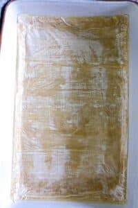 - Lightly brush the 9×13 inch pan in a light layer of melted butter. Add the first sheet of phyllo to the base of the pan.